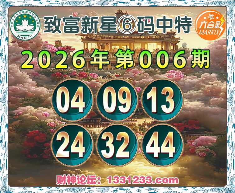 006期:【致富新星】⑥码中特⚽【04.09.13.24.32.44】开:13